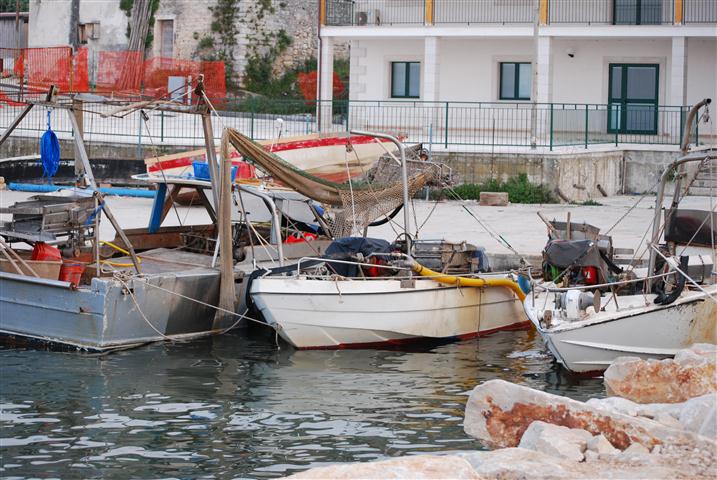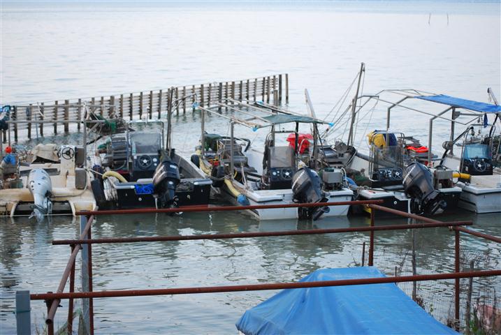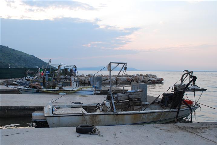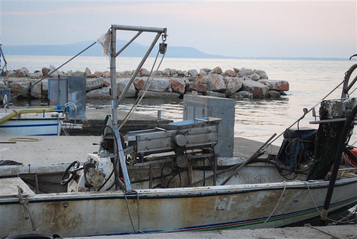 Le barche che vedete in foto stazionano tutti i giorni in località Bagno (sponda sud Lago di Varano); montano degli impianti che aspirano il fondo melmoso del lago per poi filtrarlo e ricavarne così solo le vongole.