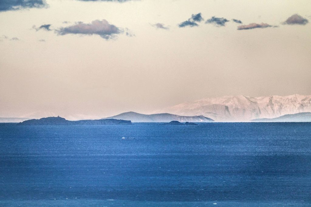 Palagruža island (leftwards), Sušac island (middle) and the Dinaric Alps ("Dinarsko gorje", horizon).