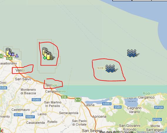 Ho “barbaramente” evidenziato i punti di interesse. Le 3 pompe gialle sono le piattaforme Rospo di Mare. Estratto dalla nostra PETROLMAP |