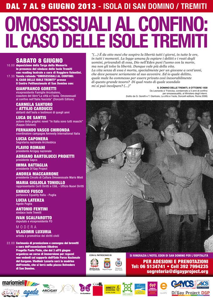 Non erano reclusi perché non avevano commesso alcun delitto. La loro colpa era di appartenere ad una categoria dai confini incerti, quella di individui potenzialmente pericolosi per l’ordine pubblico, da allontanare dal tessuto sociale. Fu così che prostitute, persone con disabilità fisica e mentale, esponenti di minoranze etniche e religiose ed altri soggetti – non potendo essere imprigionati per alcuna violazione di legge – vennero esiliati dal regime fascista. Quella stessa sorte toccò in primis agli omosessuali, gli invertiti, gli arrusi: si calcola che furono trecento i condannati al confino in Italia; alle Isole Tremiti la loro concentrazione fu straordinaria, intorno ai 56 individui, una comunità che man mano si integrava col territorio e trovava il coraggio di sopravvivere con dignità e speranza.
