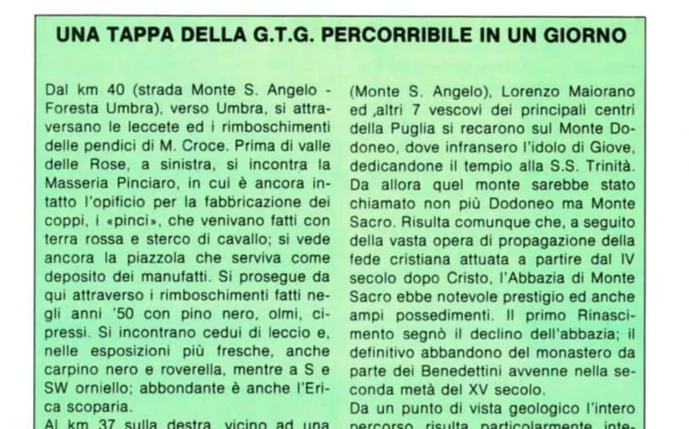 Alle origini della “mitologica” Grande Traversata Garganica (GTG), un percorso ad anello di circa 200 km che si snoda tra la costa e l’entroterra del Gargano. di O. La Marca; P. Corona; P. Mori; R. Zanuttini; E. La Posta. G. P. Cantiani; M. Marchetti; R. Vecchia; A. Vidulichestratto da L’UNIVERSO, 1985, Volume LXV Clicca qui se non visualizzi il PDF